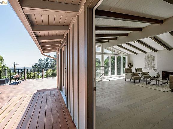This stunning 4 bedroom, 3 bathroom Mid-century home is located in El Cerrito's sought-after Country Club Terrace neighborhood and has spectacular panoramic views of the San Francisco Bay, San Francisco, Marin Headlands, and the Golden Gate Bridge. The house has just been extensively remodeled with thoughtful, tasteful finishes and offers a great room, open kitchen, four bedrooms, three bathrooms, a laundry room, a two-car garage, and a new rooftop deck with SF Bay views. Nestled into the hillside, this spacious home is situated on nearly a third of an acre of land and features a classic Mid-century architectural exterior with a broadly gabled roof; board and batten vertical siding; and a series of tall picture windows topped with decorative clerestory windows that emphasize the pronounced roofline and provide plenty of bright light inside.