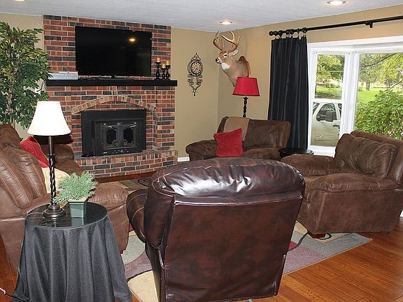 Super clean and move-in ready with large fenced yard, this nice 2 bedroom (w/potential for another in the basement), 2 bathroom home has been refreshed from one end to the other! Updated with new hardwood floors, carpeted bedrooms, tiled baths, new and efficient furnace and A/C, pretty white cabinetry and countertops, new doors and trim and fresh paint! Fireplaces located in the living room and in the cozy downstairs family room. Special features include: a metal roof that will last for years, brick front, 2 car garage, a huge deck, a variety of trees and plantings all just a block from the schools! Brokered and Advertised by RE/MAX Town and Country. Listing Agent, Anita Riley.