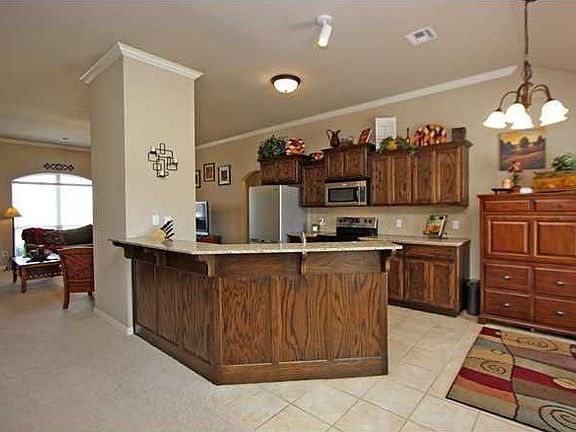 High ceilings,open floor plan,large bedrooms with a nicely done master bath.Just to name few things but there is more!!Brand new granite counters in kitchen as well as new lighting.Kitchen also has stainless steal appliances. New laminate flooring in living, dining room and hallway. New carpet in all 3 bedrooms. New storm shelter installed in the garage