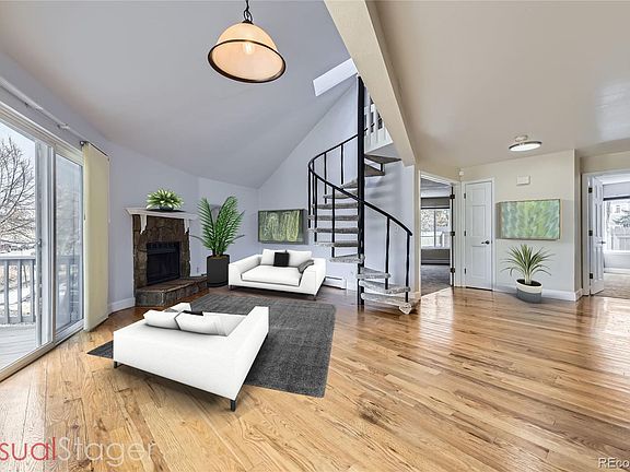 Unique Octogon Style Home! This Condo feels more like Townhome living! Wrap around Deck with Views of the Mountains and small Lake! Newer Roof and Windows! Brand new Carpet! Boiler and Hot water heater less than 10 years old! Open Floor plan has wood floors and vaulted ceilings and lots of sunny windows! Cool Loft Space could be used for Media/TV room/ office/ extra sleeping space for guest/yoga space/workout space! Family room has spiral staircase to the loft, wood burning fireplace/mantle! Primary main floor bedroom has a full private bath and two oversized closets! 2nd Main floor bedroom has access to the second full bathroom! Kitchen is roomy with large built in island, Stainless steel Refrigerator and Dishwasher! Stackable Washer and Dryer in the Unit! Dining space has large windows and sliding glass door to the wrap around deck! Private fenced back yard for entertaining. A one car oversized garage with 2 additional parking spaces in front of the garage. Walking distance to Costco, Retail, restaurants/Whole foods/ Sprouts! Easy access in any direction with quick access to Hwy 285 and C-470 and I-70! Some Images are virtually staged.