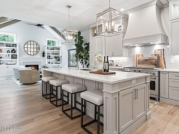 Nestled in one of Louisville's rare and prestigious gated communities known as The Breakers at Prospect, this newer construction home is a beacon of luxury and modern living. Boasting an open-concept floor plan, every detail has been meticulously designed to elevate your living experience. The front dining room, with a view of the neighborhood lake, sets a tone of elegance and repose. A stylish wet bar with chic tiling and large butler's pantry leads you into the breathtaking kitchen.Here, granite countertops and stainless steel GE Cafe' appliances await to inspire your gourmet adventures. A gas range, warming drawer, French door refrigerator, abundance of cabinetry, and elegant island seating all add to the grand experience this kitchen offers. Adjacent to the kitchen, a cozy sitting room provides an intimate space for relaxation, reading, or engaging conversations. Adorned with a gas fireplace, exquisite wood beams, and access to the screened in porch, this unique space creates a peaceful setting. The living room is a showcase of elegance, with its soaring coffered ceiling and built-in bookshelves which frame the gas fireplace, creating an inviting ambiance that is perfect for gatherings. The first-floor primary bedroom is a sanctuary of privacy and comfort. It offers direct access to the screened porch, allowing for serene morning moments, ideal for peaceful morning coffee. The ensuite bathroom is a haven of luxury, featuring a standalone soaking tub, large tile shower, private toilet closet, double sink vanity, and a walk-in closet with direct access to the laundry room. The practicality extends to a convenient mudroom off the garage, perfect for organization. The home's three car garage flooring is enhanced with an epoxy finish. Upstairs, three additional bedrooms and two full bathrooms offer comfort and privacy to your guests. An office nook overlooks the lake, providing an undisturbed setting for work or study. The lower level is an entertainer's dream, boasting a spacious family room and recreational room with a kitchenette, ideal for hosting gatherings. A fifth bedroom, a full bathroom, and a home gym or flex room completes this versatile space. Outside, the screened porch overlooks the lush green backyard which features a patio and outdoor fireplace. Every element has been meticulously crafted, creating an unparalleled living experience. Enjoy living just moments away from local dining & shopping, with easy access to US-42, I-265, and I-71, making your commute a breeze!
