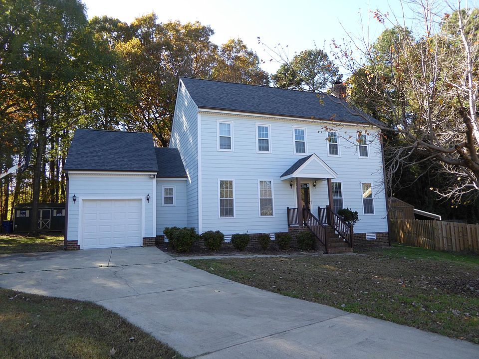 Charming 3 bedroom, 2 1/2 bath colonial home in North Ridge with 1 car garage and large back yard and storage unit. Close proximity to 540 express way. The interior of the home has just been repainted. The main floor is open concept with hardwoods throughout. The living room features a fireplace with French doors that lead out to the freshly painted covered screened in porch. The kitchen has an eat-in area and features granite countertops, subway tile back splash and a pantry. Appliances include fridge, range, dishwasher and a new microwave. Separate laundry room off of the kitchen. 1/2 bath on the main floor. All bedrooms have ceiling fans and walk in closets. New LVP flooring has just been installed. Application fee is $110. Tenant pays all utilities - gas, electric, water and yard maintenance. All pets upon approval and pet fee. Driveway parking.