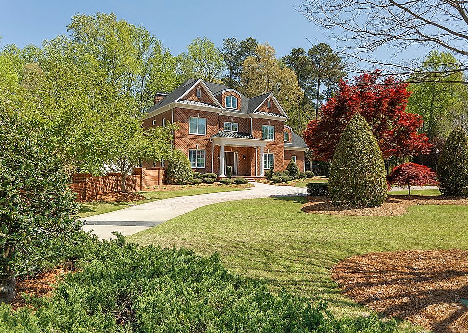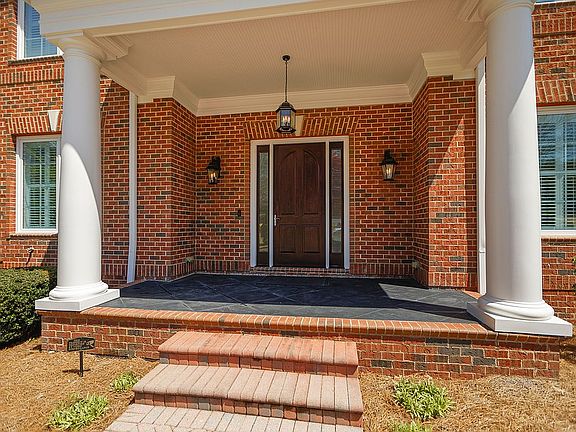 This traditional Georgian style all brick home located on a 1+ acre cul de sac lot emulates a period of classical architecture. The tall circular columns, Kolbe-Kolbe oversized casement windows, arched brick dormers, and triple crown create an elegant and truly timeless maintenance-free showcase. Brazilian Cherry hardwoods and a grand staircase design with long winding handrails which are enhanced by classically derived moldings greet you at the entrance with views of the circular hallway on the second floor. 3 driveways with pavers and curbing and oversized 3 epoxy coated garages allow parking for a minimum of 15 cars. The extensive landscaping with Zeon Zoysia and fescue is irrigated by a smart-controlled system with 32 zones and 280+ rotors and sprays. The Trex Transcend composite decking and railing on the second floor offers wonderful view of the gardens and manicured woodlands in the backyard. Floor to ceiling 14 ft. brick mantle and hearth inset with rough sawn cedar beams surround the wood-burning fireplace with a gas-starter in the sunken library area. The stained crown and wainscoating create an intimate and cozy setting for fireside chats. The gourmet kitchen peeks into inviting library through two sliding doors. The oversized kitchen island with Cleopatra granite and black cabinets are surrounded by cherry cabinets and a gas Wolf range plumbing fixtures and custom Kalco light fixtures are found throughout the home. Entertaining is made easy with separate guest quarters in the daylight walkout basement which has a state-of-the-art media room with a 10 ft. screen. This luxury residence is more traditional that the widely popular open floor plan concept which will be appreciated by the work at home family due to its increased layout of separate rooms and privacy. County taxes only! Minutes to downtown Cary and Apex.