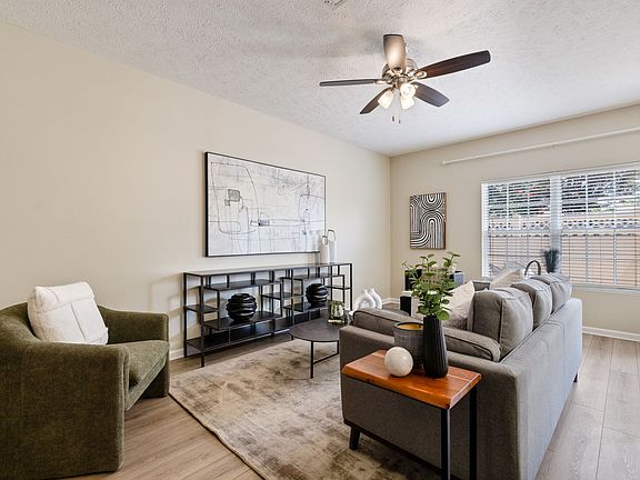 The light-filled and open floorplan is ideal for both entertaining and everyday living. A spacious great room leads into a charming dining area and gleaming white kitchen featuring granite countertops, stainless steel appliances, and plenty of cabinet space. Sliding glass doors open to your own private patio—perfect for morning coffee, a quick Zoom call, or a relaxing evening cocktail. A back gate leads directly to a green space, ideal for a quick game of fetch with Fido.