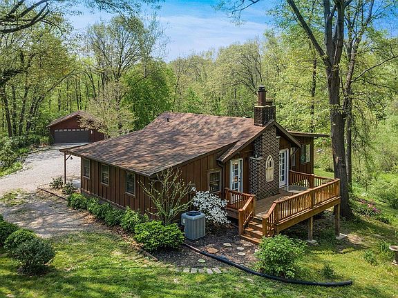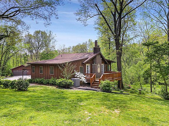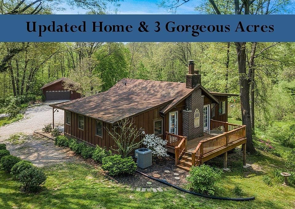 PEACE & SERENITY await you at this amazing 3 acre property! This pretty house is tucked away in your own little paradise and is move-in ready! Main floor features an updated kitchen w/granite countertops, tile backsplash, ceramic tile floors, cherry cabinets & cathedral ceiling. Cozy up in the hearth room w/wood beamed cathedral ceilings and fireplace(propane) or relax in the 2nd living room w/wood ceiling and gorgeous woods & lake views. Two bedrooms & one full updated bath complete the main floor. Walkout lower level w/ceramic tile flooring features a 2nd fireplace (woodburning), 3rd bedroom & 2nd updated bath. The outside space is spectacular w/a wraparound deck w/beautful views, patio, abundant parking space and 24x30 detached garage. This property is perfect for relaxing and enjoying the quiet and also entertaining family & friends!