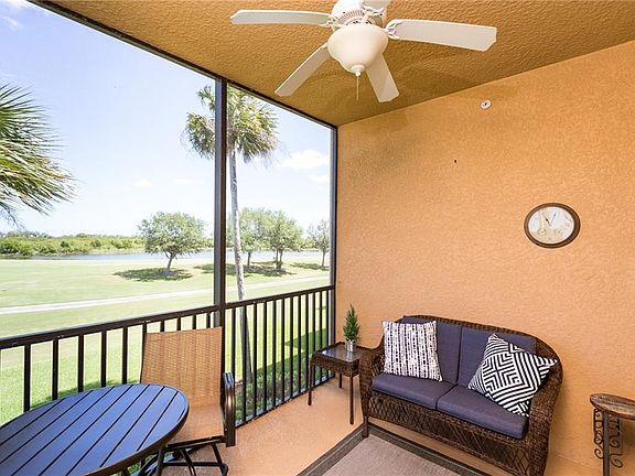 This may be one of the BEST VIEWS in River Strand! The lanai captures an amazing panoramic "WRAP AROUND" lake view on the left side AND a golf and water view on the right side! How cool is that? There are FEWER Colonades than any other terrace model in River Strand--you should sprint to see this MINT CONDITION and TURNKEY FURNISHED (inquire for details) & Fully Stocked residence today! As you enter, you will notice that this adorable condo is awash with natural light. The 2 side windows also ensure you can always catch a glimplse of that terrific Wrap Around Lake View too! The extra den, which doubles as a 3rd bedroom, offers fantastic "flex appeal". This open floorplan has notable upgrades, including tile floors, granite & 42 inch cabinets. NEWER A/C installed in 2018! Designed on a split plan for privacy, the Owner's Retreat has a terrific view & features 2 large closets & en-suite bath. There is a storage unit too--a perfect place for golf clubs, bikes, & beach chairs. A community pool is also right across the street! This condo includes free equity membership to 27 hole Arthur Hills championship golf course & River Strand Country Club, w/ access to the tennis center with 8 HAR-TRU lighted tennis courts. There are TWO clubhouses, restaurant, and the main pool has a poolside grill, sand "beach" and resistance pool. You also have use of the 3,500 sq. ft. fitness center with separate aerobics room with 24hr access. This complex is within 1 mile of I-75--a quick commute to St. Pete, Tampa, or Sarasota!
