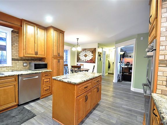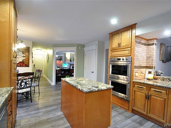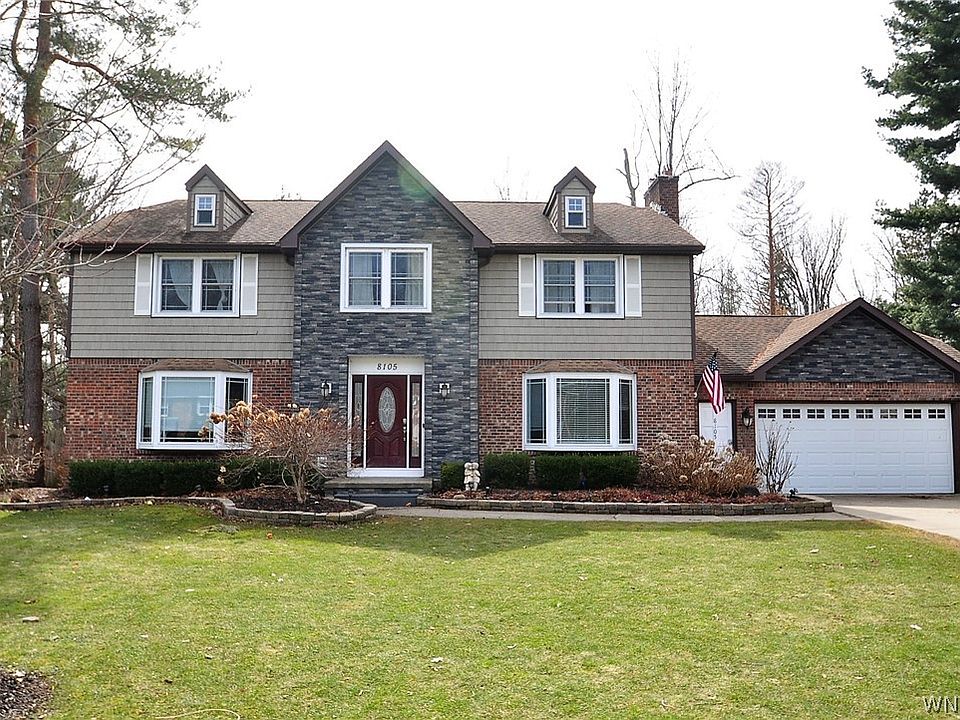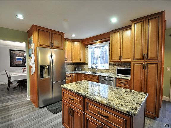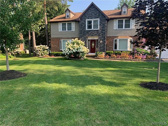 Come home to Farmington Woods this 4 bedroom 2.5 Bath center entrance colonial has been completely rehabbed. Once a Tudor now the Brick Vinyl and Stone give the curb appeal that extra pizzazz. 1st Floor has commercial high impact vinyl woodgrain floors. Kitchen upgrade includes double oven and stainless appliances with granite tops and high end cabinets. Sliding glass door leads to a massive 2000 sq ft above grade deck that has views of a private well stocked fishing pond, a hippy hang out covered gazebo and 8 man hot tub. Room sizes are spacious especially the Master suite Cozy Fire Place and oversized walk in closet waiting to be customized. Finished Basement. All baths have been renovated. Custom Crown molding everywhere. Entire 2nd Floor is adorned with tasty Brazilian cherry hardwoods. New Windows, newer roof, newer furnace, new concrete wide driveway. Extra Lot with Pond Access Included in Sale Separate Tax Id SBL:43.09-4-5.5.