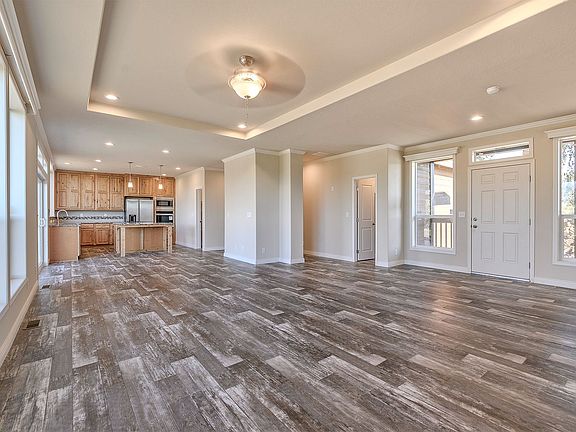 The fully equipped kitchen features generous cabinet storage and stainless steel appliances, including a refrigerator, electric glass-top range, dishwasher, built-in microwave, and wall oven. The open living and informal dining area boasts high ceilings for an airy, inviting feel. Extra large sliding glass door steps out onto a large stamped patio (patio cover to be installed). The surrounding yard will be professionally landscaped in the spring of 2026