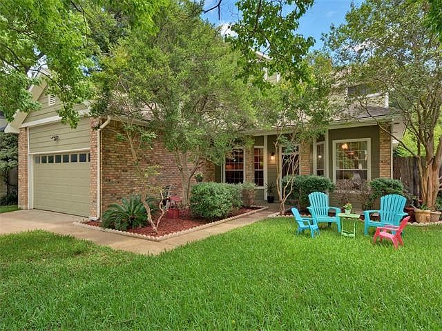Beautiful 2 story Hunter's Chase home on quiet cul-de-sac with mature trees. 4 bedrooms, 2 baths, gourmet kitchen, formal dining, vaulted or high ceilings throughout. Large master suite with fireplace, sitting area, huge master closet, garden tub, two vanities and separate walk-in shower. Enjoy the shady private yard with large deck for entertaining. Easy access to parks, neighborhood pools, tennis courts, and nearby retail and restaurants. Round Rock ISD with award-wining Pond Springs Elementary.