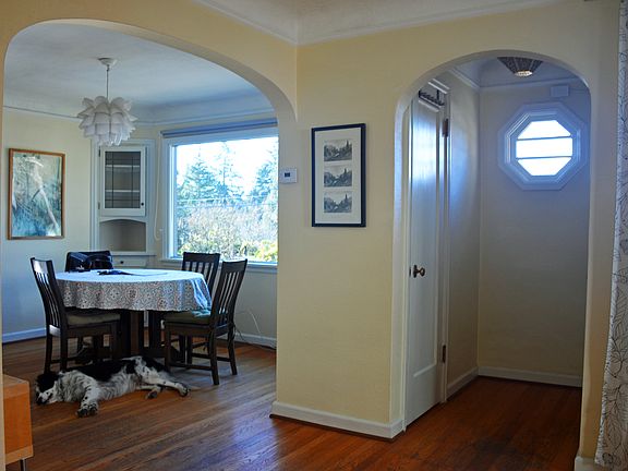 Mid-century charm in SW Portland Welcome 2018 in your new home. Private and tranquil, this southwest Portland home sits high in Burlingame, close to I 5 and easy commutes anywhere—minutes to downtown---but up and away from the highway noise heard just blocks away, affording spectacular views from the 2 front bay windows. Watch the sunset from your living room in a beautifully preserved but well updated 2-bedroom home. Hardwood floors, fireplace, a large private back garden with fruit trees, 2 patios, re-modeled kitchen and bath---newer appliances and cabinetry, new windows, full-size tub and tiled shower---full dining room with built-ins, central air conditioning, a shop area, oversize garage, 1.1 bathrooms. Great potential in the full basement. Windows throughout bring in light and commanding views. Walk to Market of Choice, South Burlingame Park, and restaurants. Near Multnomah Village shops, Hillsdale Farmers market, Tryon Creek State Park, bus and I 5. A quiet neighborhood with full sidewalks. 1,200 sq ft plus 900 in basement and garage; the property is 7,400 sq. ft. Gas heat, earthquake secure, decommissioned oil tank. Capital Hill Elementary, Jackson Middle, and Wilson High Schools Call 503 754 0811 to arrange for a showing any time. BAC.