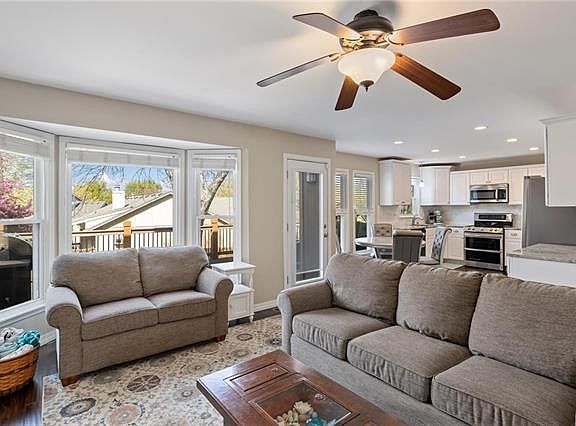 Hustle on over to lovely Lenexa and see the sweetest 2 Story this side of State Line! Over 2,500 finished sq ft of updated living space. Overflowing with curb appeal, darling corner lot, beautiful new concrete drive + walk way, and new wood fence! Light and bright renovated kitchen with S/S appliances all included! Handsome built-ins flank the fireplace. Head upstairs to the peep the spacious bedrooms and Owners Suite, and remember to pick your jaw up off the floor when you see the bathroom and huge walk-in closet! Expansive deck just off the kitchen/family room offers a flow ideal for entertaining. Finished basement with 1/2 bath offers great flex space whether you need a home office, rec room, or separate area for guests. Walk to elementary school, pool, and park. Excellent hwy access and proximity to groceries, restaurants, and the outstanding Lenexa City Center!
