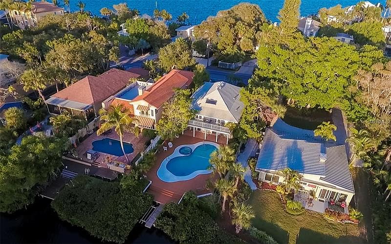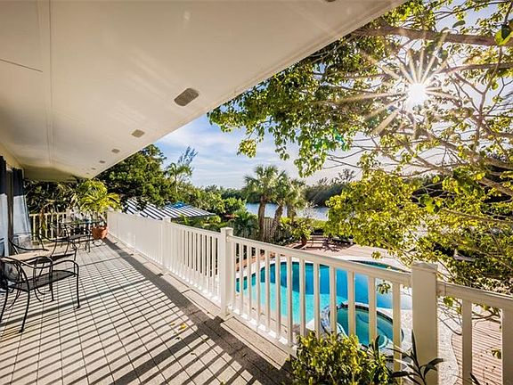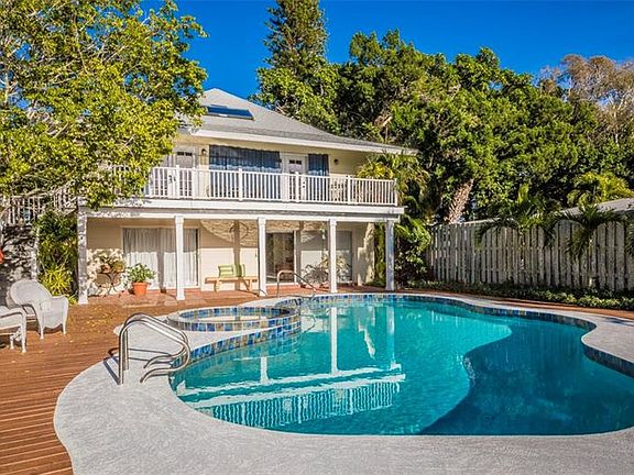 Discover the natural beauty of the Siesta Key lifestyle with this charming home overlooking pristine Heron Lagoon. Experience stunning sunset views every evening from the balcony of this westward facing home. By day, lounge by the saltwater pool or enjoy kayaking, fishing or paddleboarding from your own backyard dock. The spacious pool deck features a covered seating area, privacy fencing, beautiful landscaping and a spa. Inside, this unique gem offers lovely touches such as wood flooring, French doors, and abundant windows to maximize the gorgeous water views. The downstairs includes a flexible living space with bathroom that can serve many functions, while upstairs are a living room, kitchen, three bedrooms and two baths. This remarkable property is shaded by mature trees and includes a two-car garage. Its location is highly desirable on Siesta Key's south end, close to Turtle Beach, the bayfront marina and an array of local restaurants and shops with the island's trolley running past seven days a week. Live the resort lifestyle you've always dreamed of with this exceptional home in a true tropical paradise.