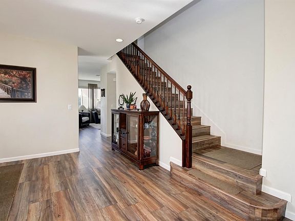 Beautiful Taylor Morrison, 5 bedrooms (4 up & one down), features an open floor plan, stunning wood-like floors, upgraded tiling, island in kitchen, rich, dark Beech cabinets. High efficiency energy due to owned (not leased) microinverter Solar panels, & ceiling fans. Formal dining, family room w/fireplace, large master suite. 2nd floor laundry room w/cabinets & utility sink. Professionally landscaped yard, patio with custom stone knee-wall & play area, lush lawn. Near 2 parks.