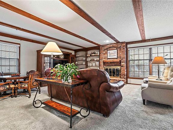 The family room exudes warmth with its exposed brick gas fireplace and inviting wooden beams, creating a cozy ambiance. Meanwhile, the kitchen dazzles with its gleaming hardwood floors and abundant natural light, making it a delightful culinary space. The master suite provides a serene sanctuary with plush carpeting and a spacious layout, ensuring your comfort.