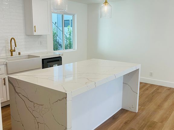 This gourmet kitchen has brand new appliances including refrigerator, designer farm sink, subway backsplash, custom shaker cabinetry, and large prep island with waterfall countertops