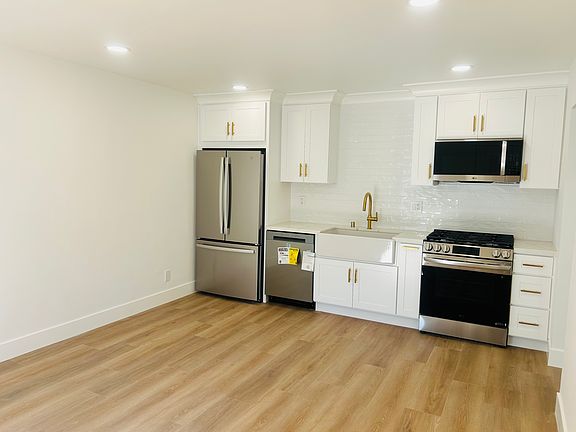 - Designer kitchen with all new appliances including refrigerator, modern farm sink, subway backsplash, quartz countertops, and custom shaker cabinetry.