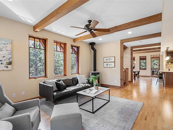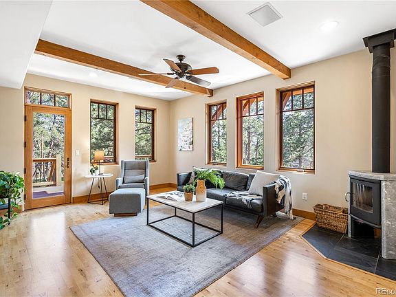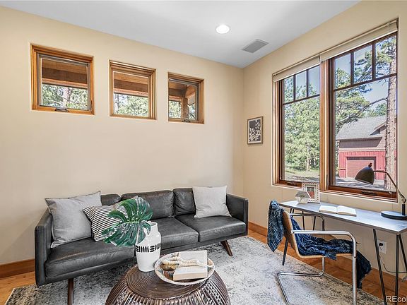 Nestled and landscaped in loving harmony with the beautiful pine forest this exceptional contemporary high-quality home is just minutes from the down-town Golden and the metro areas. The luxury and abundance of natural light in every room accentuates the space provided by the integration of high ceilings, beautiful natural Mesquite staircases, and open-faced beams. Covered decks on the North and West sides and open outdoor seating areas on the South and East side enables the enjoyment of soft breezes and the surrounding nature on this 1 acre charming lot. The modern tiled kitchen's stainless appliances complement the wood finished cabinets and Silestone counter tops. Designed to provide several areas for peaceful-privacy and gatherings you feel welcome in every space. Each floor offers home-office or a cozy nook potential including the wonderful elevated loft, the side room of the living room, or in the finished garden level. The spacious detached 3-bay garage incorporates an 864 sq ft open room above, complete with the necessary utilities to allow you to finish it to meet your desires as a work area, storage area, or perhaps a remote guest suite. If you're looking for a quiet, peaceful, relaxing care-free contemporary home in a fantastic location, this is the one for you! You can experience this virtually by following the link on this page.