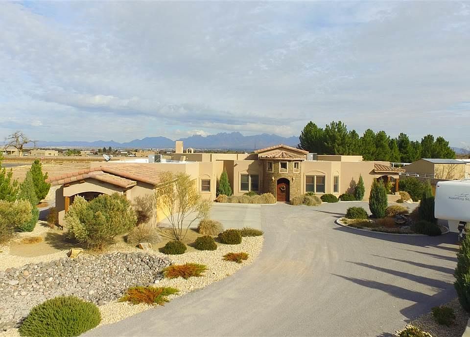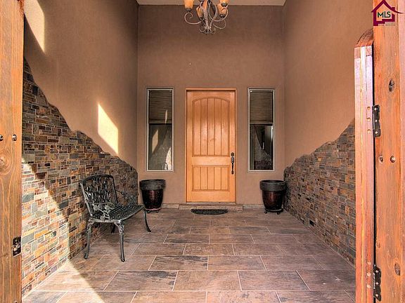 3 BEDROOM, 2.5 BATHS, Approx 3,594 sqft, Built in 2007. BOLD architectural features. Dramatic slate front entry with 8' custom door, extensive tile craftsmanship, large lighted nichos; situated on 1.0 acre just a short distance from historic Mesilla! You'll appreciate a well designed floor plan. Each BEDROOM has its own bath plus a stylish powder room. Upgraded wood clad windows; hand-troweled wall texture. BONUS ROOM (14.5x16.5) could serve as FAMILY ROOM or MEDIA ROOM; separate OFFICE. Wonderful KTICHEN (large wraparound granite breakfast bar, island, stainless appliances, soft close drawers, pantry, stacked stone accent wall). LIVING ROOM with raised ceiling, large wood beams, tile flooring, fireplace & huge east-facing windows with mountain views. Split MASTER BEDROOM suite with cove ceiling, 2 huge walk-in closets, luxurious BATH with whirlpool tub, glass block, tiled shower & custom mirrors. Large covered patio with fireplace/banco, frig, sink & grill. 4-Bay GARAGE (approx. 1,120 sqft) plus RV parking.