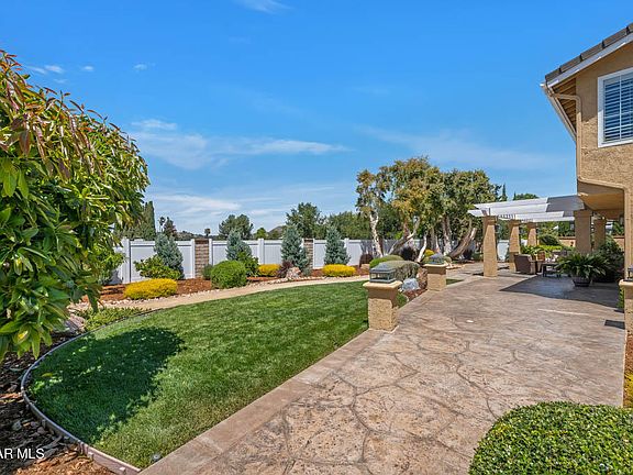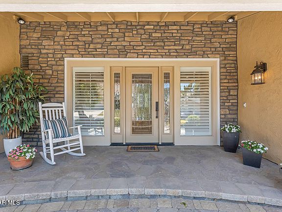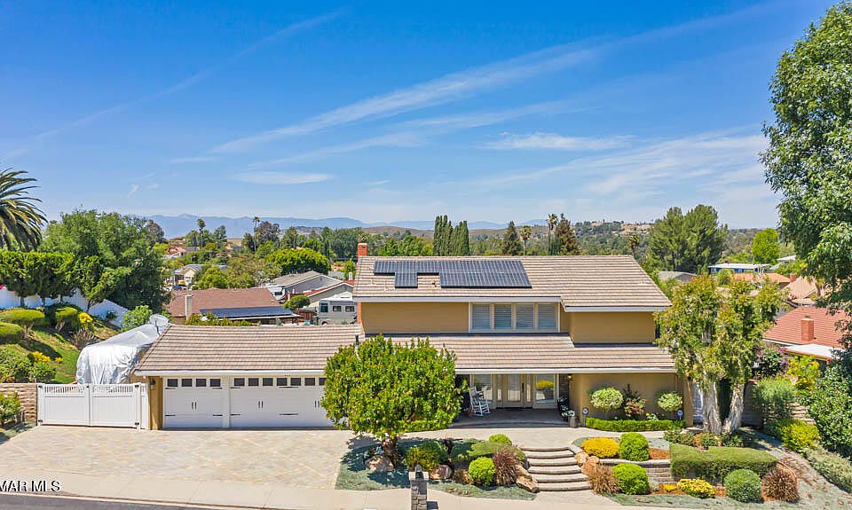 Come tour this IMMACULATELY maintained and upgraded Newbury Park home with RV Parking and a 3-car garage. Got toys? This property's got you covered! Vaulted ceilings, loads of natural light, plantation shutters, a floating staircase and hard surface flooring throughout create a crisp, open feel. The kitchen has been stylishly remodeled with quartz countertops, waterfall edges, white cabinetry, a farmhouse sink, gray subway backsplash and stainless appliances including an internet-connected double oven, built-in refrigerator and separate wine cooler. Undercounter lighting makes this the perfect place to whip up some awesome meals. Take your coffee in the breakfast area, or step through French doors and enjoy the private side patio, complete with charming arbors. This useful floor plan includes formal living and dining rooms as well as a spacious family room, which is highlighted by built-in bookcases and a toasty fireplace. On the second level you'll find a gracious primary suite with vaulted ceilings, transom doorways, custom built-ins and walk-in closet. The en suite bath has been beautifully remodeled with a granite topped dual-sink vanity and travertine shower surround. Upstairs you'll also find three additional bedrooms and a nicely remodeled hall bath. This home is literally ready for you to move right in! Added plusses: Pella windows and doors, oversized laundry room, finished garage with epoxy flooring, tankless water heater, high speed optical fiber access, Simply Safe security system and OWNED solar. The exterior of this property is just as impressive as the interior. The front hardscape is done entirely in paving stones and provides the perfect backdrop for the thoughtfully designed, drought tolerant landscaping. The rear yard features shady, stamped concrete and flagstone patios, a decomposed granite walkway and mature landscaping. It's like having a botanical garden in your own backyard. Since this lot is elevated, it also enjoys privacy and a view of the mountains to the north.