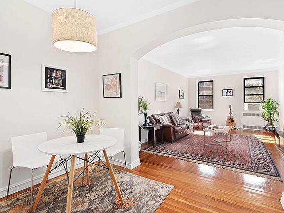 Showing by appointment only. Message direct for a private showing. Enter your home into a spacious dinning area / entry-foyer that opens into your expansive south facing living room that can easily be configured for a variety of uses. Pre war details feature an arched entry, a built in book shelf, crown moldings and high ceilings. The kitchen has been recently renovated with a new countertop, cabinets, sink and facet. Enjoy your double exposure windowed eat-in kitchen with stainless steel appliances including a full sized dishwasher and refrigerator. The bathroom has been partially updated featuring a new vanity, sink, plumbing, and lighting. Your master bedroom currently fits a king bed and features a stylish sliding barn door and 4 separate closets. A flexible office/den/nursery is off the bedroom with ample light. This coop has a new butterfly virtual intercom, live in super, laundry room, bike room, art deco details, elevator, and storage for rent.
