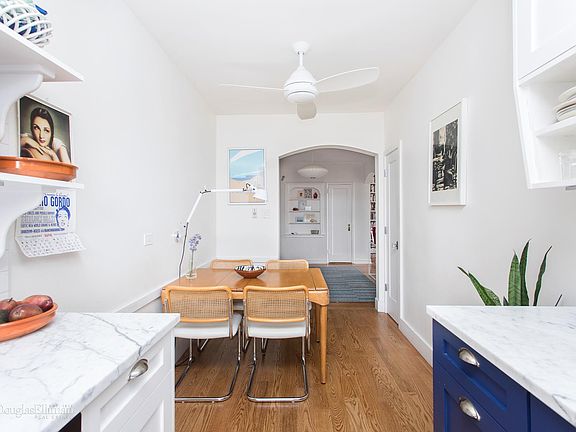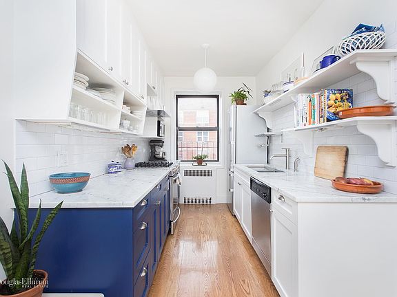 This charming and expansive two-bedroom, two-bathroom in a well-kept building has a wonderfully versatile house-like layout and loads of prewar details. An entry hallway leads to a grand foyer that can easily function as a dining space or a home office. Off the foyer, through an archway, is an exceptionally roomy, windowed eat-in kitchen with custom open shelving, marble countertops, a sleek Blomberg counter-depth fridge, a handsome undermount drainboard sink, a dishwasher, and a convenient shelved pantry. Also off the central foyer, through another beautiful archway, is the light-filled living room, which is big enough to accommodate both living and dining areas. A large master bedroom has two exposures and an en suite bathroom. A second bedroom, also generously sized, has a huge closet and gets great southern light. The apartment also has a windowed second full bathroom, many south-facing windows, stylish Minka ceiling fans throughout, a sweet treetop Brooklyn view, original oak floors, and ample closet space.811 Cortelyou Road has a classic prewar lobby, elevators, a live-in super, full-time porter, laundry room, children's playroom, storage space (waitlist), and bike storage. Composting and recycling of textiles and electronics is available. It is also pet-friendly- one dog under 40 lbs is allowed per unit on approval. The Kensington location is close to the both the Q and F trains and the many shops, cafes, and restaurants of Cortelyou Road, where there is also a year-round farmers market.