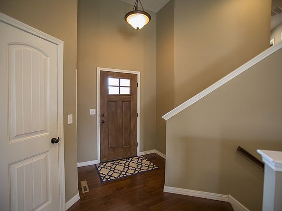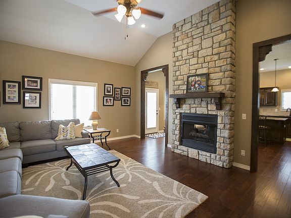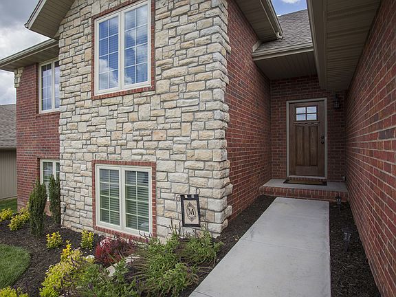 Gorgeous, all brick and stone home with 5 bedrooms and 3 1/2 baths, 3 car garage in Columns at Century Park in Nixa. Beautiful hardwood floors (including the staircase). Beautiful, spacious kitchen with lots of custom, dark alder cabinetry including a pantry cabinet, stainless appliances with a double oven, granite countertops and built-in bar. Stoned see through fireplace from the kitchen into the living room. Beamed openings Downstairs is another living area, bedroom, full bathroom and storage. The yard has a sprinkler system, a privacy fence and an extra large patio that has been added on to.