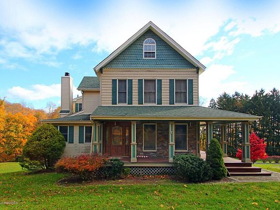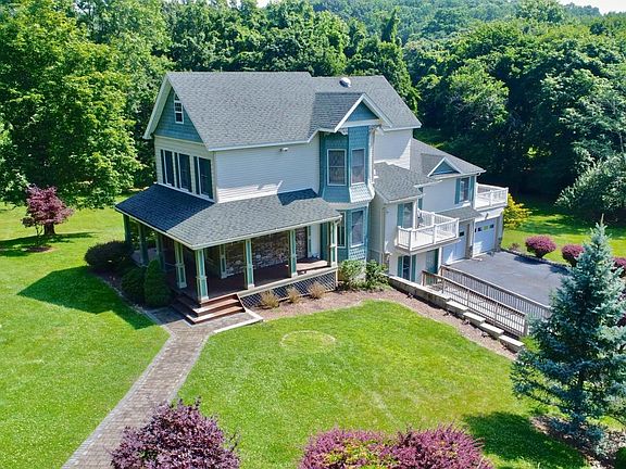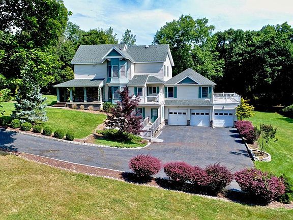 4 AcreS!! Old world charm meets modern day amenities with a rolling private and scenic 4.1 Acres. Perfect home for a large family with walk out basement or a car enthusiast with 7 car garage!! This unique home is set back from the main road with an inviting belgium block circular driveway. The wrap around front porch welcomes you Spacious kitchen includes 42'' cabinets, Jen-air and Bosch appliances, granite countertops, backsplash dbl sink & radiant heating. Tremendous great room with fpl, inlay hard wood flooring and sliders w views of beautiful property. Bedroom on the first floor off 2nd LR with FPL for the privacy of your guests. 3 Bedrooms upstairs and large loft area perfect for a home office. Basement is walk out with additional bedrooms and full bath perfect for a large family