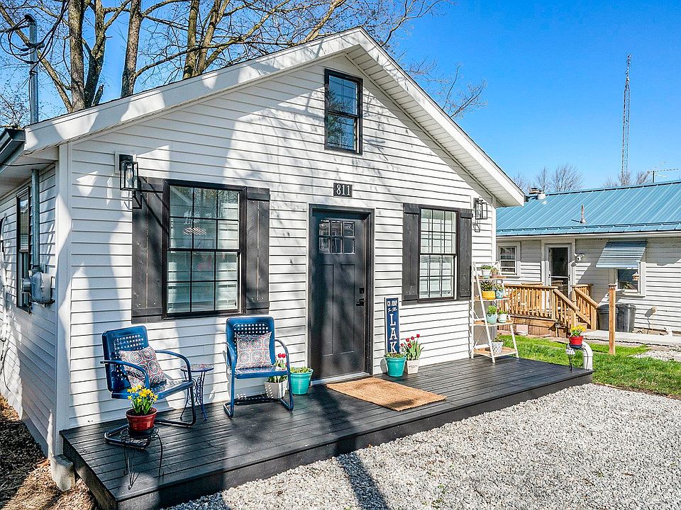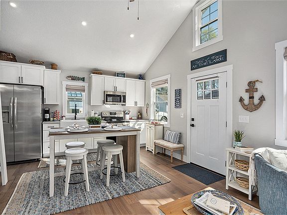 This adorable bungalow looks like it's been taken straight out of a luxury tiny house magazine! Just over 500 square feet, this lofted style lake cottage is the perfect weekend getaway or year round home. Fully remodeled in 2023, you will love the open concept living room with vaulted ceilings and kitchen with a farmhouse style sink, stainless steel appliances and beautiful cabinets. The main floor offers a convenient bedroom and bath with full size washer and dryer. The loft can be used as guest quarters or extra space for an at home office. Home Details: Furnished, soft close drawers/cabinets, freshly stained deck, new shutters. new blinds, 2 mini-split heat pumps, lots of natural light, new light fixtures.