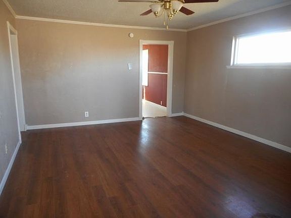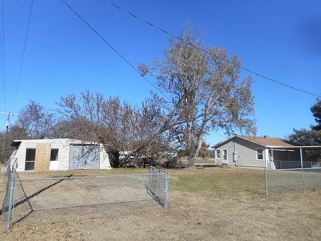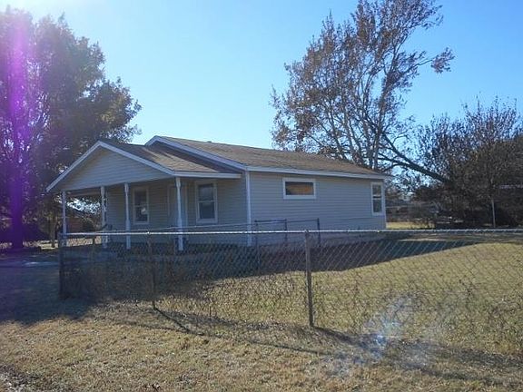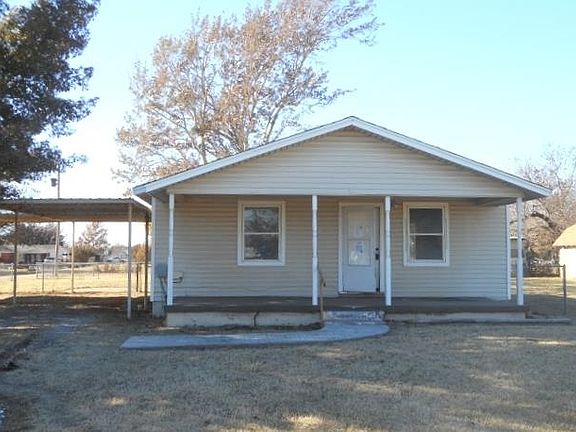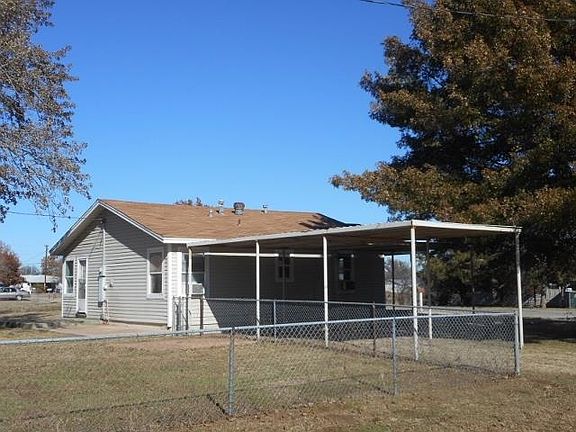 Small town atmosphere! This home has a siding exterior and a large covered front porch, as well as a nice sized back patio. There is a carport on the side of the home, plus an additional storage shed. The home is newly remodeled and includes vinyl plank flooring in the living room and bedrooms and tile flooring in the bathroom and kitchen, totally renovated kitchen (including breakfast bar that opens onto the living room) and bathroom (new EVERYTHING), new guttering, and a new central heat and air unit. The roof is 5 years old. The yard is very large and fenced. Thethe big outbuilding in the picture was damaged in a storm amd has since been completely removed. There is a concrete slab remaining - could be used for a future storage addition!