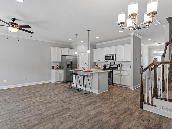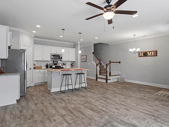 This stunning Wake Forest townhome, boasts nearly 1700 SF. The open-concept creates an inviting atmosphere, perfect for entertaining & daily living alike. Kitchen features an island, complemented by granite countertops & is fully equipped, complete with a gas stove, & the refrigerator remains for added convenience. Luxury plank vinyl floors grace the main level, offering both durability & aesthetic appeal. Additional it includes a finished one-car garage, providing secure parking and extra storage space. With its blend of stylish design elements and functional features, this property offers a luxurious yet practical living experience in the heart of Wake Forest.