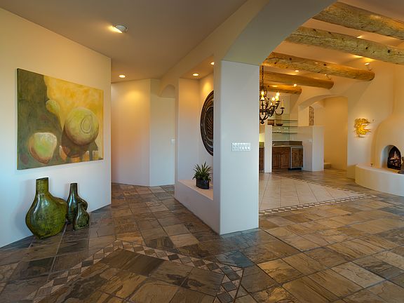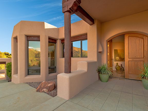 Breathtaking red rock views surround this highly desirable home in beautiful Mystic Hills. A warm, welcoming feeling is augmented by rich architectural features: pine log poll ceilings, slate and inlaid stone flooring, kiva fireplaces and archways, curves and niches throughout the home. A beautifully appointed gourmet kitchen and breakfast area offers granite counters, distressed wood cabinets (continued throughout the home), Sub-zero and Viking appliances and luxury finishes. The owner's suite has separate his and hers bathrooms and closets. Step out onto one of the many view patios or sundeck, sink into a comfortable lounge or chair and simply relax.