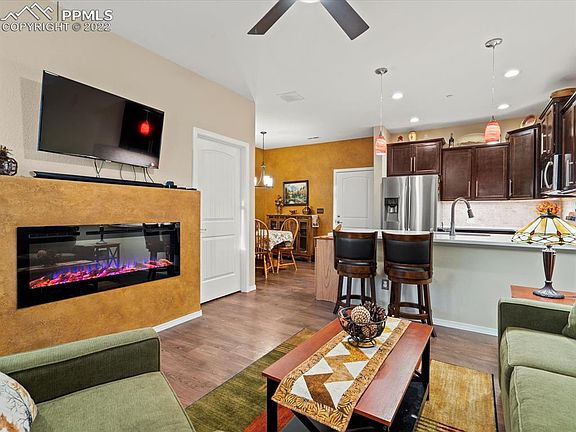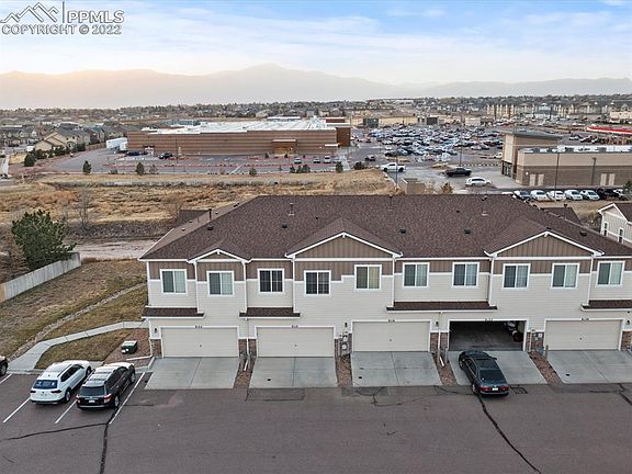 Beautifully upgraded townhome with a view of Pikes Peak from master bedroom and living room! This townhome floor plan was custom designed to put the master bedroom on the west side to enjoy the view of the mountains, one-of-a-kind in this community. You can also enjoy the sunsets over pikes peak from the concrete patio. This upgraded kitchen features quartz countertops, a breakfast bar, and decorative cabinetry. An electric fireplace was custom added to enhance the ambience of this living room. Upgraded master bath features a large shower, dual vanity, and large closet. Laundry is easily accessible on the top floor with all three bedrooms. Front door and patio face an open creek bed area making this townhome feel open and spacious. Conveniently located to the new King Soopers and walking trails, this townhome is a must-see!