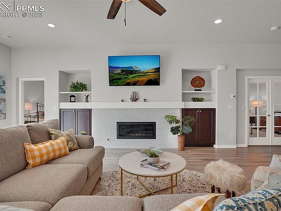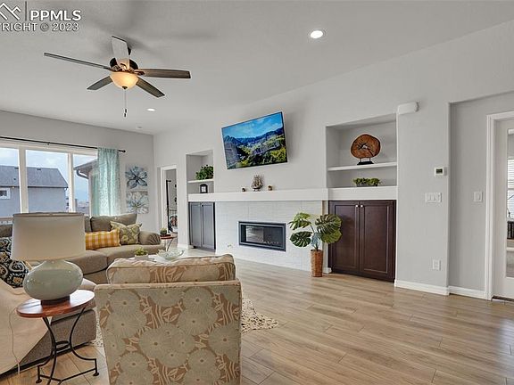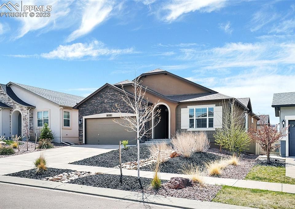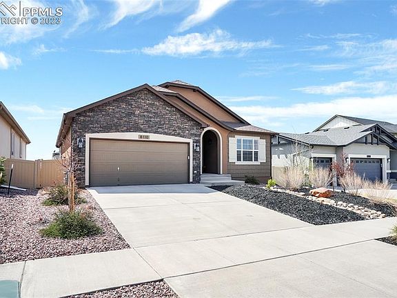 This stunning 2018 ranch style home boasts 4 spacious bedrooms plus an office with beautiful French doors. The luxurious master suite features a spa shower and provides a serene retreat for the homeowner. Enjoy the breathtaking Pikes Peak and mountain views from the comfort of your own backyard, surrounded by vinyl fencing and lush turf. The gourmet island kitchen is a chef's dream come true, complete with all appliances, including a gas stove and granite countertops. The open dining area features built-in bench seating, perfect for entertaining guests or enjoying family meals. Relax in the great room, which features a stunning cosmo fireplace and plenty of space for comfortable seating. The trex deck provides a great place to take in the views and enjoy the beautiful Colorado weather. Don't miss the extended 2-car garage as it will fit an F-150 The walkout basement provides easy access to the backyard and features a huge unfinished storage area, perfect for storing all your belongings. This home is located in the award-winning D-20 school district and is conveniently located near parks, hospitals, and all amenities. Don't miss out on this fantastic opportunity to own a beautiful home in a highly sought-after area!