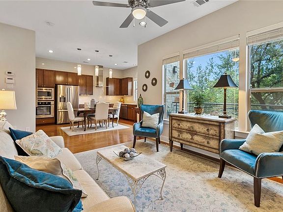 Wake up to stunning, panoramic views of downtown Austin nestled in an emerald landscape in this beautiful condo, tucked in the foothills of the Texas hill country! This modern beauty features over-sized windows, incredible views, privacy, two balconies, a beautiful community pool with views of its own, and the convenience of a lock and leave home with close proximity to downtown and both Lake Austin and Lake Travis. The chic, spacious kitchen and living room, in addition to the second living space on the top floor provide plenty of room to entertain your guests in style. Perfect for the homeowner looking for a reasonable commute to the city, while enjoying the laid back lifestyle of West Austin, or an ideally located second home, this sophisticated property will not disappoint.