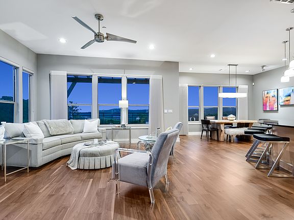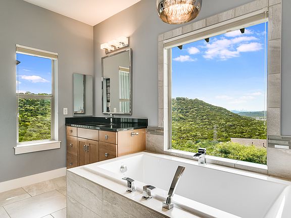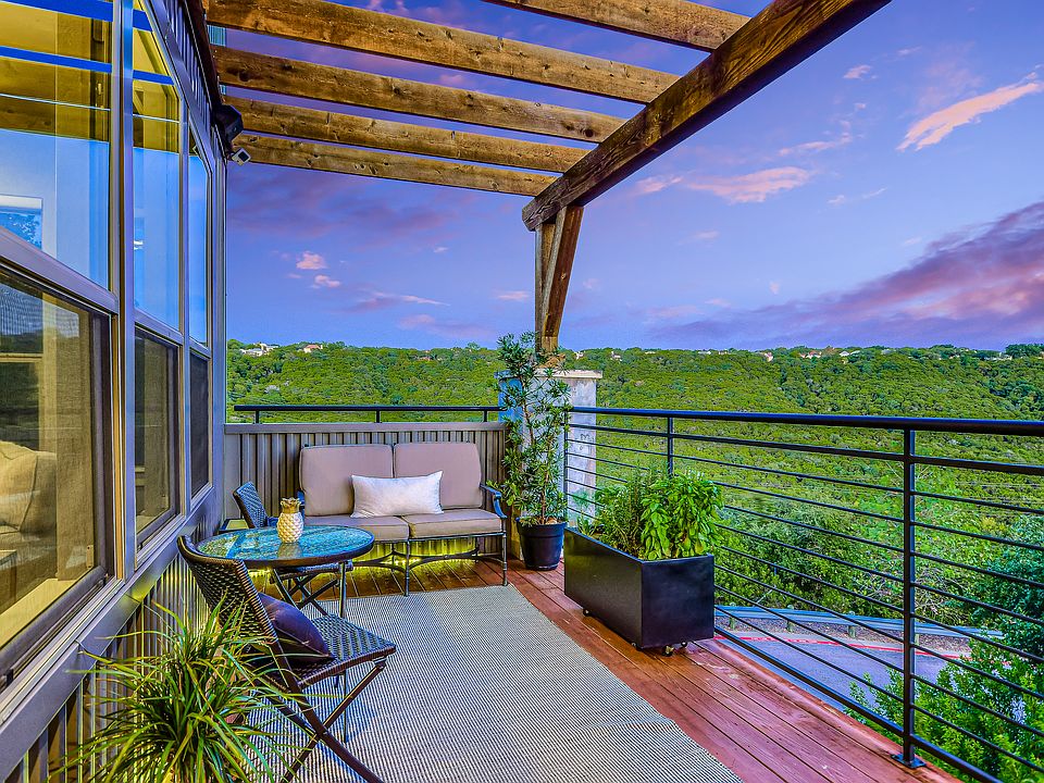Sipping coffee with morning views of the sunrise and savoring peaceful evenings watching the sunset are the gifts of a perfect southern exposure. Nestling against the Canyon Preserve, this condominium on the premier location in the Hillside community feels like it's a world away but the view of Austin's skyline is a reminder that the urban action of the City can be accessed in a moment. Inside, this striking, elegant home unfolds in front of you displaying rooms designed with an artist's eye toward marrying sunlight with texture and finishes. Rich, walnut floors throughout provide a luxurious anchor for light and dreamy spaces that seem to float above the trees with bright, sunny views through large windows that go on forever. Its environs provide an intimate retreat from busy days or a base for large or small scale entertaining. Ivory and white stone and glass backsplashes marry light, modern, maple cabinetry to black granite counters. Thermador appliances are an ideal site for creating gastronomic wonders or rolling out favorite take-out finds. A full butler's pantry hosts the supporting cast of serveware, linens and smaller appliances at the ready should the guest list grow. It's also home to a wine refrigerator, cabinets and plenty of drawers. Views of verdant forested hillsides abound from windows that surround the dining and living. As a designated preserve, these neighboring trees will provide the tranquility of nature to be experienced inside and outside on a magnificent patio. A very modern fireplace of polished stone sits in a corner to be enjoyed without obstructing the dramatic vistas. Up the gleaming walnut stairway another large beautiful living area can play host to a huge TV or provide a quiet intervals between bedrooms upstairs. The panoramic views are even more dramatic from here. The master bathroom has separate vanities with Restoration Hardware silver mirrors separated by a deep, jetted soaking tub with a massive window where a relaxing bath can be enhanced by views of hillsides, trees and the City. A large glass shower and separate dressing table provide a beautiful and easy setting while getting ready for the day. The closet is masterfully designed with abundant shelving and hanging space. There is so much more...a secondary bedroom has its own balcony and view. There is a wide, tech closet set up and wired for office equipment. There is ample storage in the 2 car garage as well as room for a second refrigerator. There is extra parking when needed. The laundry room includes a utility sink. Window coverings and light fixtures are carefully selected and placed to augment the artistic perfection of each room. But the first thing you see upon entering the home is what will stick with you. An idyllic space enveloped by unalterably green and fantastically sweeping views. Gleaming surfaces wed organic materials resulting in a home that is a work of art. This home does not and never will feel like a condominium, but with no maintenance, there's more time to relish the luxury of living high above and away from it all.