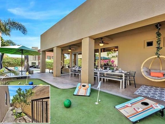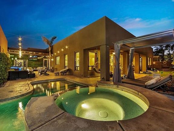 Upscale 6 bedroom home in gated community. Immaculate interior and exterior contemporary design. The floor plan is spacious throughout the home. Outdoor living area is fully equipped for entertaining, sit and relax near the fire pit or at the outdoor bar/barbecue area. Detached casita with a living room and bedroom & bathroom. This property accommodates everyone for relaxation and entertainment. Pool & Spa, pool table, arcade games, putting green, card table and sauna.