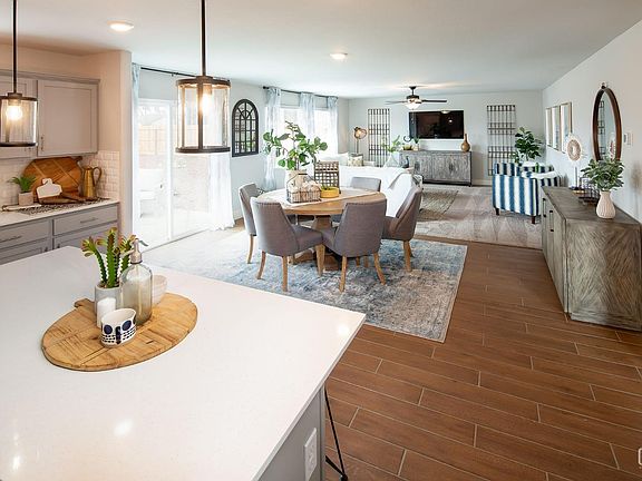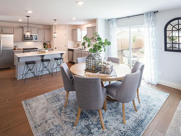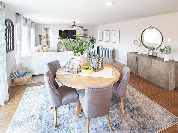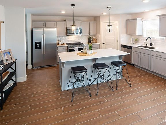 This spacious two-story, five bedroom, three bathroom home offers approximately 2,814 square feet of living space and is enhanced with 9' ceilings. A bedroom and a full bathroom are located on the first floor just off the entry. The open-concept living area opens to a large kitchen featuring shaker-style cabinetry, quartz countertops with backsplash, a walk-in pantry, a center island with pendant lighting and snack bar, and Whirlpool® stainless-steel appliances including a range, microwave and dishwasher. Black finishes are standard throughout the home. The formal dining area is located adjacent to the kitchen. Upstairs is an open loft, the main suite and three additional bedrooms, as well as the indoor laundry room. The main suite has an adjoining bathroom with dual vanity sinks and a large walk-in closet.