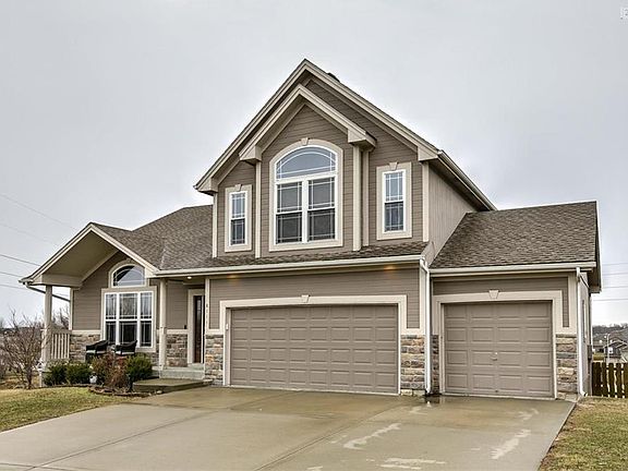 Open California split on a double lot. KC Address, Liberty School District and 1.1 acres. Great room has vaulted ceilings, kitchen has formal eating area as well as breakfast bar, deck off of kitchen, huge master suite has walk in closet. Lower level walks out to fenced yard. 4th true bedroom and bath downstairs and sub-basement offers lots of storage below. Three car garage. Empty lot next door is part of the property. Very close to Kellybrook Elementary.