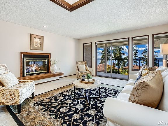 Stunning Sound and Mountain views from spacious top floor unit in popular View Point. Open floor plan, skylights, radiant heat, freshly painted and custom lighted display cabinets. Large kitchen with beverage cooler and lots of storage. 2nd fireplace in master bedroom, private view lanai, laundry room in unit and private garage. Quiet, gated community with well-run HOA, 2 gazebos, walking trails, outdoor pool, sauna and sports court! Pet friendly. A must see!