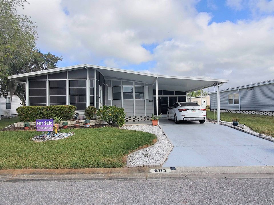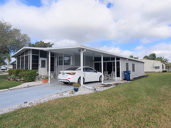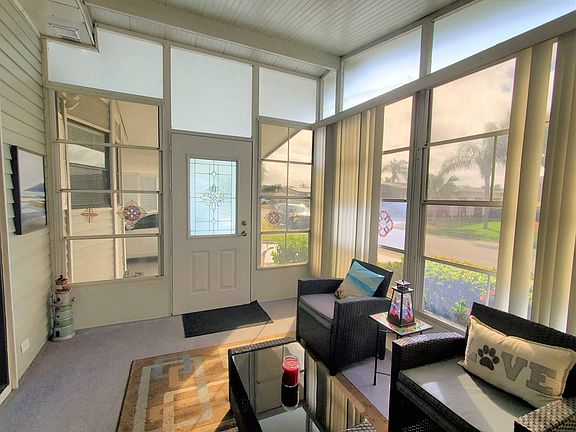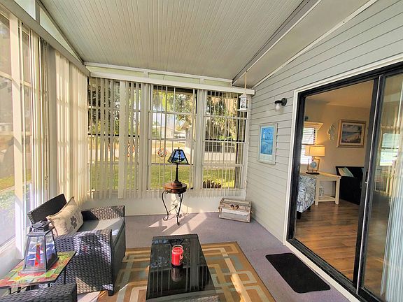 Just Listed $72,000 Turnkey Beautiful turnkey, 1989 Palm Harbor Home with lovely curb appeal. Entering the front Florida room there is an outdoor security camera and motion lights. The Florida room has vaulted ceilings, indoor/outdoor carpeting and windows all around with screens. This space is cozy and bright. Huge open living room that opens to the dining room and kitchen. The hardwood floors are new within the last 2 years. Vaulted ceiling throughout with AC ducts above. The dining area has a built-in hutch giving you extra storage space. The kitchen has all your major appliances with plenty of cabinet and counterspace. Spacious indoor laundry room/ office with a washer and dryer. This room has 8 cabinets above, an L-shaped office desk with drawers and a closet for your cleaning supplies. The two bedrooms are huge with step-in closets. The guest bathroom has a tub/shower combo. The master ensuite bathroom has a large vanity with a ton of storage space and a step-in shower with a sliding glass door. There is an additional large enclosed patio area with slider doors and windows. This area could be turned into a second living room. The storage shed is also large with a wet sink, L-shaped work bench and storage shelves. This space could easily accommodate your bikes, beach gear, holiday decorations, and tools. New AC April 2021. The tiedowns, gutter guards have been done within the last two years. The metal roof is 5 years old. This is a well-maintained, move in ready home! Call today to make this your Florida Dream home....it won't last long! Colony Cove is an age qualified (55+) five-star resort community of manufactured / mobile homes. The "Cove" boasts 5 clubhouses, 5 heated pools, a riverfront pavilion and private fishing pier, a private marina, a fenced dog park (very pet friendly), tennis, shuffleboard, new pickleball courts, 2 new fitness rooms, 24 hour patrol, clubs for every interest, and much more. There are daily planned activities throughout the park. Bottom line, if you get bored here, it's your own fault!! The lot rent in Colony Cove is based on the homes' location. While the monthly rent may not be the lowest around, it's by far the best value for the money. Not only does the monthly rent cover all of the amenities of the community listed above, it also covers almost all other monthly expenses such as; water, sewer, trash pickup, all property taxes, lawn maintenance. . .pretty much every monthly expense except electricity and internet. The current lot rent on this home is estimated at $982.19 per month. All listing information given to us is considered appropriate and reliable but always recommend Home Inspections by independent companies who have a background and thorough understanding of manufactured homes. We cannot guarantee the accuracy of information given to us or the condition of the home. Lot rents are determined by the community office not our company.