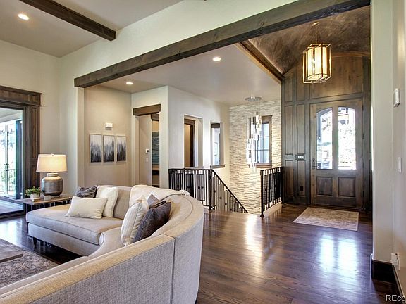Style and Sophistication in this Stunning Ravenna Custom Home! 3 Bedrooms + Study, 4 Bathrooms, Finished Basement and serene outdoor living! Features of this extraordinary Ranch-style home include custom finishes throughout, high-end lighting, multiple outdoor living areas, security system, 4 fireplaces, gleaming wide plank hardwoods, gated/golf course community, $120K in landscaping improvements, 3-car finished attached Garage, security system, tankless HW heater, finished walk-out Basement w/wet bar and MORE! Sophisticated finishes, high ceilings w/wood beams, expansive windows, bright interior and open concept floor plan provide the backdrop for this home's comfort and livability. Spacious Living Room features a cozy fireplace w/floor-to-ceiling surround, gourmet Kitchen outfitted w/island, breakfast bar seating, Granite/Quartz counters, glass tile backsplash, Bosch appliances, walk-in pantry and eating area. Main floor Laundry, private Study/Home Office and Primary Retreat featuring trey ceiling, ceiling fan, access to outdoor living area, walk-in closet w/convenient Laundry access plus en-suite Spa Bathroom complete w/modern tile, finishes and fixtures. The Finished Walk-Out Basement offers 12 ft. ceilings w/wood beams plus 2,307 SF of additional living space featuring a spacious Family Room w/fireplace and full wet bar, Game/Bonus Room and 2 generously sized secondary Bedrooms each w/en-suite Bathrooms. Entertaining or casual living extends to the tranquil outdoor living areas featuring wrap around covered deck/patio, dual fireplaces, water feature and fire pit providing a true outdoor oasis for enjoying the stunning views and beautiful Colorado weather. Don't miss the opportunity to be a part of this exclusive Ravenna community!