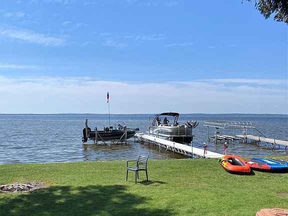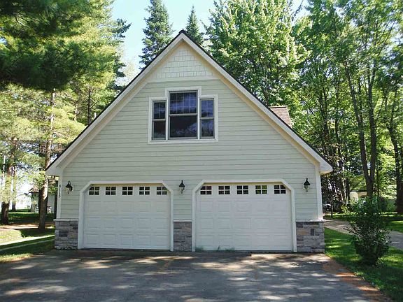 Combined total of 2 beds/2 baths, 1 den/office & add'l sleeping loft in cabin. Garage with finished 2nd floor and quaint rustic cabin offering 51 ft of sandy shoreline where the fishing is amazing!. Cottage boasts a knotty pine interior with lofted sleeping area, laundry room, 3/4 bath, kitchen, dining and living room. Spacious deck along front of cottage overlooks the North Shore. Amazing 3 car garage offers a ton of finished recreational area with a kitchen, bonus room, den and bath. Beautiful cement board siding with stone accents, double pane windows, a/c, ceramic tiled 3/4 bath, natural gas heat, water, electrical, garage door openers with double entry doors, and solid wood flooring on 2nd story. Large concrete drive, covered patio with firepit, and 2 14x20 sheds. Garage has custom wall mounted cabinetry, glazed floors, newly caulked and painted. Too many amenities to list! Call for your tour before its gone! Aluminum Roll in dock (2) 32' sections is available to purchase with the property for $8K. Only 1 year old. Cabin is approx. 600 sq. ft. with additional 830 sq. ft. of recreational space above the garage.