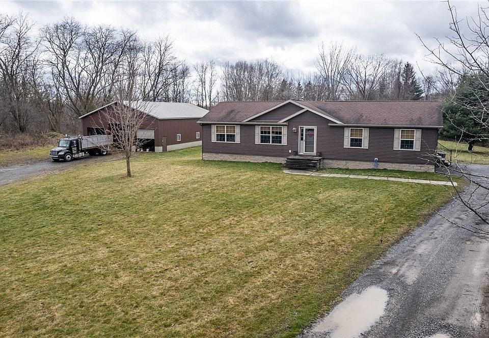 Nestled in the serene landscape between Auburn and Elbridge, this distinguished property offers an exceptional lifestyle opportunity. The meticulously maintained 3br, 2 ba ranch boasts 1508 sq ft of open concept living space with a keen eye for comfort and style. Central to the home is a custom kitchen which opens to both the living room and family room and features a large island that serves as the focal point for family gatherings. The expansive primary suite with its luxurious en suite bathroom and vast walk-in closet, provides a private retreat. Two more large bedrooms, a 2nd full bathroom and laundry/mudroom complete the homes thoughtful single floor layout. The allure of the property extends beyond its interior charms. Set on a sprawling 15 ac expanse, privacy is paramount, with the home and outbuildings thoughtfully positioned far from the road. Equine enthusiasts will be drawn to the 42'x60' pole barn with 3 horse stalls, tack area and storage. The horse facilities are are complimented by 2 pastures and a large outdoor riding ring- a perfect set up for a hobby farm. With commercial zoning there is also ample opportunity to repurpose the the space for your business ventures. Discover the potential to craft your dream lifestyle or thriving business at this gem.