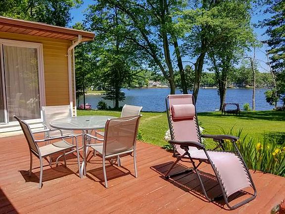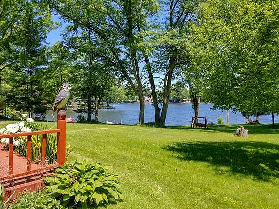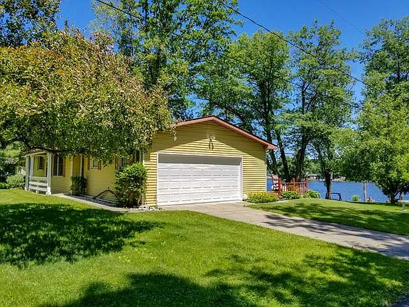 Perfectly located 3 bedroom 1 1/2 bath home on all sports Five Lakes with approximately 139 feet of sandy frontage. Great swimming, fishing, and boating lake. Nice open floor plan with beautiful views of the lake. Sit and relax on the 12x22 deck and watch the boats float by. Plenty of storage space in the 22x24 attached garage and in the 24x24 detached garage. Additional features include gradual slope to waters edge, seawall, permanent dock, shed, natural gas, forced air, central air and includes stove, refrigerator, microwave, washer, dryer, water softener (owned), and hot tub. Furnishings are negotiable. Call for a private showing today!