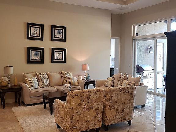 This beautiful 5 bed 5 bath home is the Charleston Grande Model on a huge private oversized lot and has so many upgrades. A fully automated resort style pool and hot tub with a firepit on the patio. The pool is equipped with a lighted led bubbler and led lights throughout. The hot tub has an enhanced waterfall that spills into the pool. The firepit and summer kitchen are fueled by a 100lb in-ground propane tank. The backyard has a mosquito misting system. Two refrigerators in the summer kitchen and two televisions on the patio. Inside has many upgrades beginning with 16 foot coffered ceilings with crown molding and 24" tile throughout. Rounded interior corners and hurricane windows. The kitchen has all upgraded Whirlpool appliances. The master has a Jacuzzi tub and separate shower and marble throughout. The house has a security system, surround sound and Bose outdoor speakers on the patio. House is set up with a transfer switch and generator power. The house is located in a cul-de-sac with tons of backyard privacy. Too many upgrades to mention it's must see!