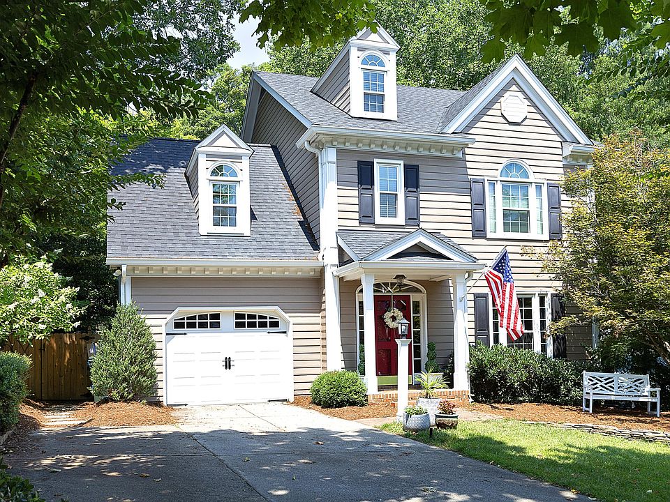 Welcome to your dream home in the heart of highly sought after Stonehenge! This light & bright stunner is close to all the conveniences nestled on a quiet cul-de-sac. Large kitchen with stainless appliances, granite countertops, a generous pantry, breakfast nook, and a center island make this kitchen beautiful and functional! The formal dining area just off the kitchen has plenty of room for those large family gatherings. The large living space right off the kitchen features a cozy gas fireplace and built-in shelves for extra storage and function. Head out to the deck and private fenced back yard to enjoy an afternoon tucked among the beautifully maintained mature landscaping. The primary suite is a private retreat offering tranquility and comfort, complete with a spa-like ensuite bathroom featuring dual vanities, a soaking tub, walk-in shower, and a substantial walk-in closet! There are 2 additional bedrooms and a full bath, perfect for family and friends! Laundry is also conveniently located on the second floor. Need room for that office, playroom, media room, or gym? The 3rd floor offers a large flex space with a wet bar. The layout is easily adaptable to suit your needs with ample room in a quiet space away from the rest of the home. 2 new HVAC units and hot water heater, new carpet upstairs, recent roof replacement. Refrigerator and dishwasher were also recently replaced. Lots of shopping, dining, and entertainment options within walking distance, as well as convenient access to highways and RDU Airport.