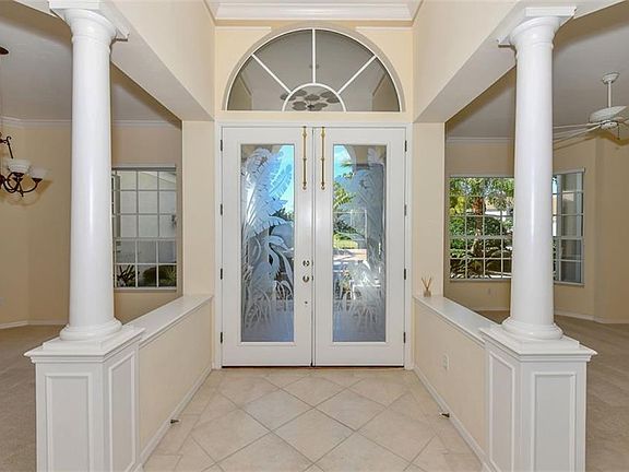 Stunning Resort style home located within the gates of University Park Country Club. This elegant light and bright home boasts a beautiful double etched glass front door, and fabulous views of the gorgeous three level resort style pool with water feature and spa upon entry. Enjoy entertaining guests on the beautiful screened in lanai with outdoor kitchen, Fisher Paykel Appliances, granite counter tops, large sink and refrigerator. Open floor plan and office with custom built in cabinetry. Pool views from almost every room. Master ensuite bath offers dual sinks, large walk in closets and a large soaking tub and walk in shower. Kitchen has updated appliances and large kitchen island for preparing meals. Enjoy the Florida lifestyle in this lovely Country Club setting. Excellent location. Only minutes to UTC mall, downtown Sarasota and Lakewood Ranch.