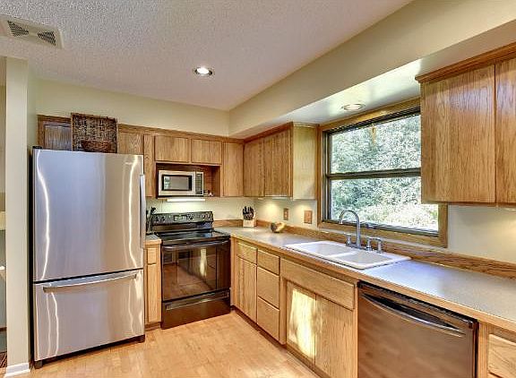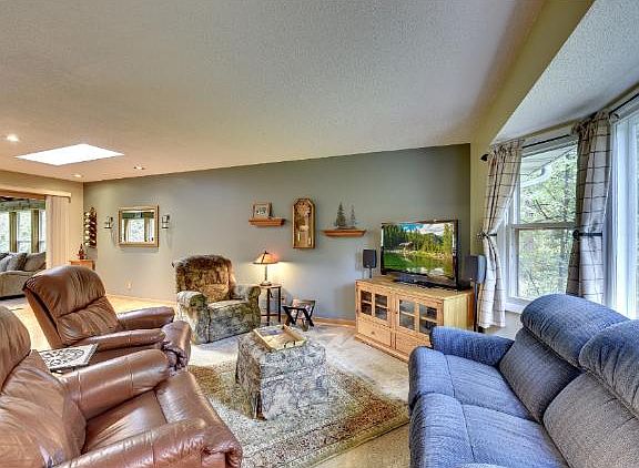 Home sets up on Extra Large lot( .74 acres )w/ newly installed high impact roof & skylights.Cozy porch leads to private backyard w/ perennials. Open kitchen & living room floor plan. Nice front entry off main level family room. Must See for nature lovers!, Directions East Bush Lake Road - West on Highwood - North on 82nd, immediate left on Lea Road.