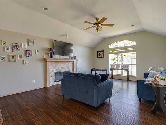 This home has great bones and an easy flow floor plan. A charming gas log fireplace sits in the generous sized living room. A bright and open kitchen and dining space is poised ready for meals with loved ones and friendly catch ups. Bedrooms are along the south side with primary bedroom at the back of the home. The primary suite is the star of this home. It features double vanities, a large shower, extra linen storage, expansive closet and a jetted tub. Both secondary bedrooms have large closets. Secluded outdoor covered patio with ceiling fan is fantastic for outdoor entertaining. Upgrades include new roof as of 2023, water heater and fence. The home is located minutes from the Kilpatrick Turnpike & NW Expressway Restaurants. Don't miss out on this prime offering!