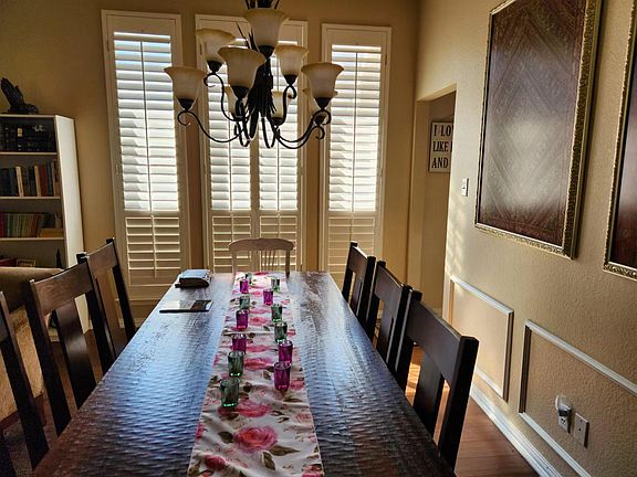 Elegant 1 story home awaits a tenant. Plantation shutters throughout the front and side windows, wood floor in living, dining and family room. Open and split floorplan, 2 bedrooms in front, master in back. The kitchen features new dishwasher and faucet. The large master suite has ensuite bath with separate tub and shower and separate vanities. TV mount holding 70-inch TV and wired inside the wall above fireplace. ADT security system with sound and motion detection. Backyard offers you a covered patio for relaxing. Excellent schools and neighborhood. Close to shopping center and mall and Highway 121. Renter is responsible for the utility and yard maintenance. No smoking. Only cat is allowed with $400 pet deposit.